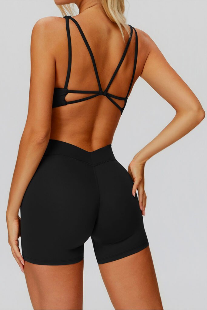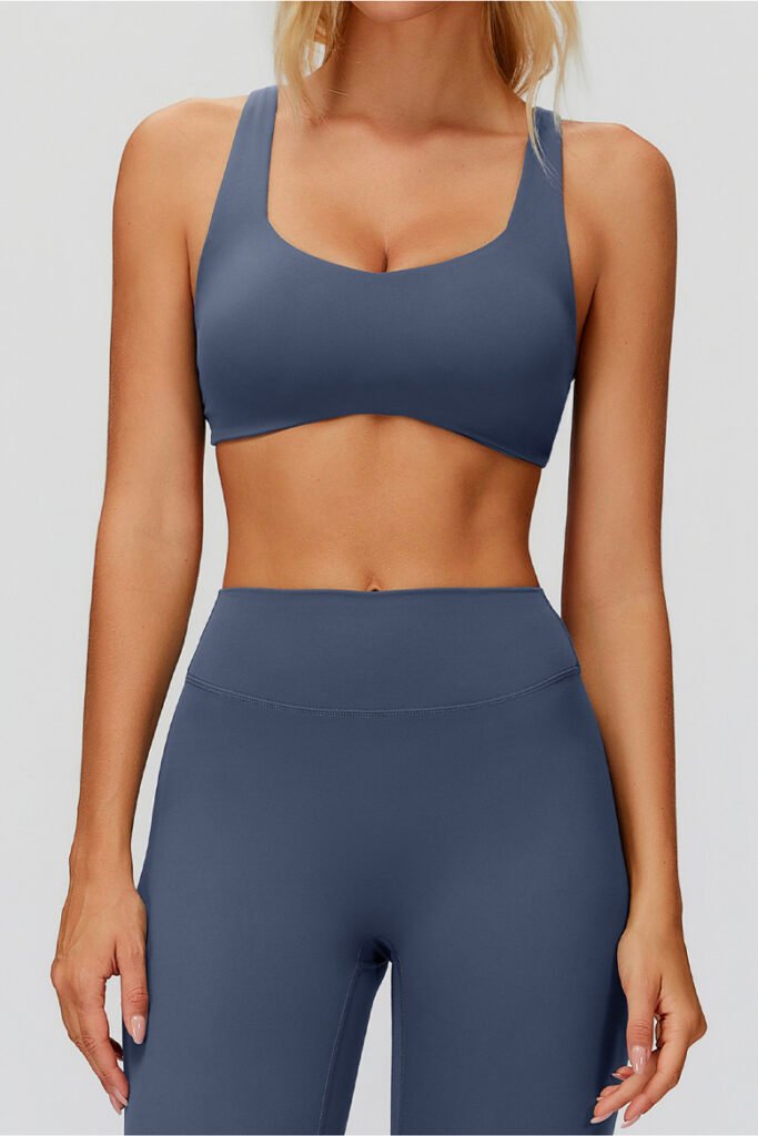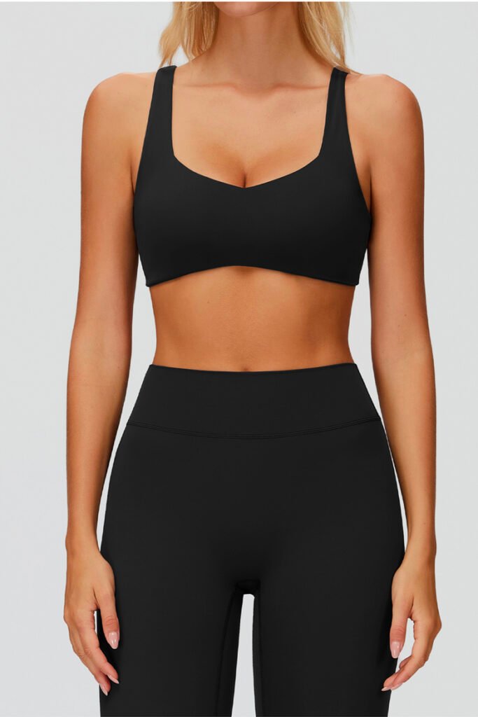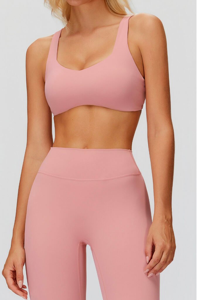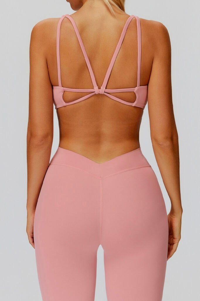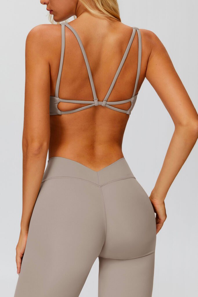 Designed for performance and style, this strappy-back sports bra offers lightweight support, breathable comfort, and a sleek, sculpted silhouette ideal for yoga, pilates, and studio workouts.
