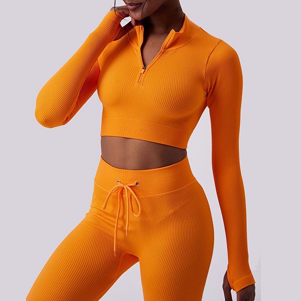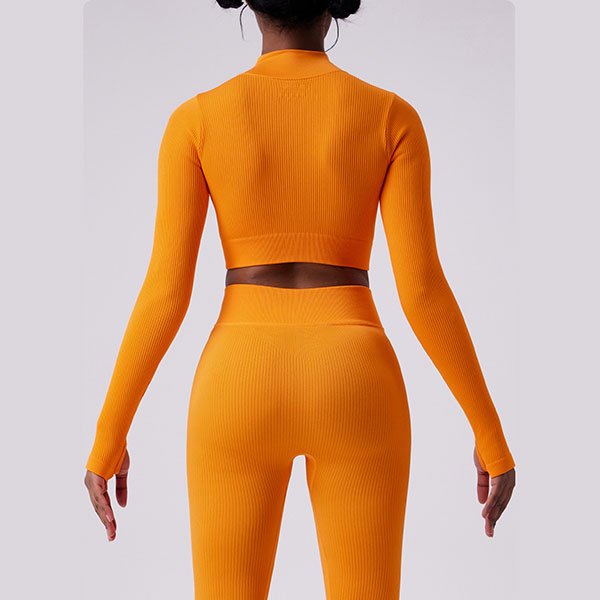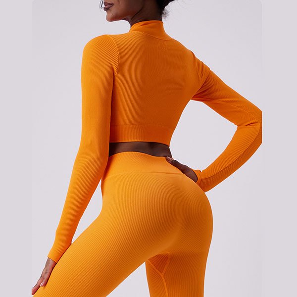 This seamless zip-up long sleeve sports top in vibrant orange offers a sculpting fit with breathable stretch, ideal for yoga, pilates, or athleisure. The modern design with a zip-up front and sleek lines ensures comfort and performance.